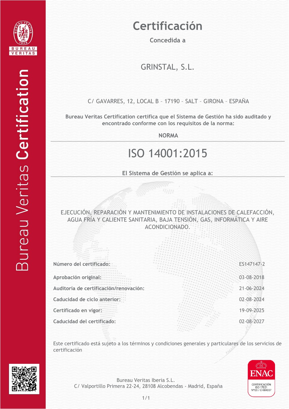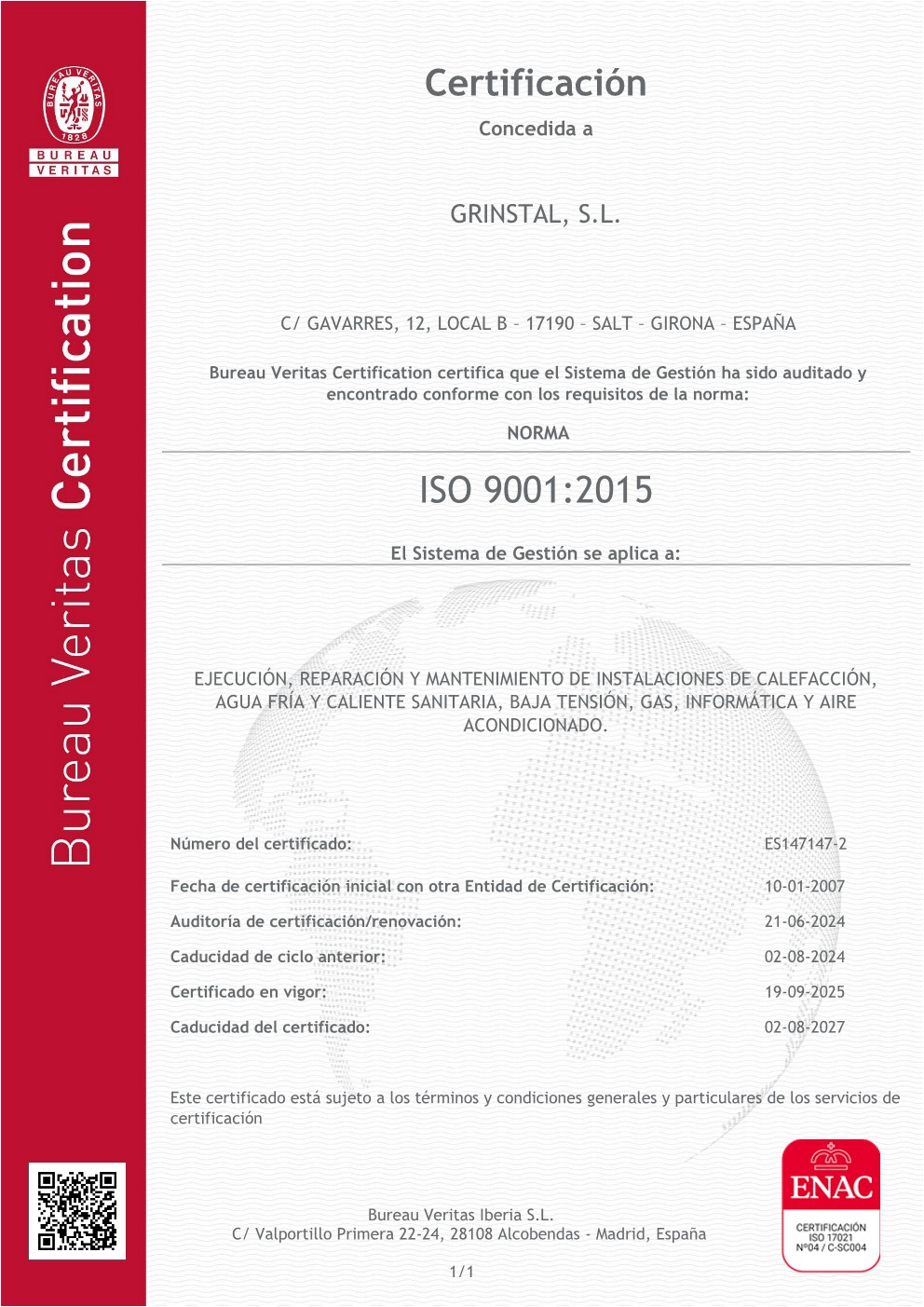 GR.Instal, S.L., certificada per Bureau Veritas en ISO 9001:2015 i ISO 14001:2015 amb els números de certificats ES147147-1 i ES147148-1 respectivament.